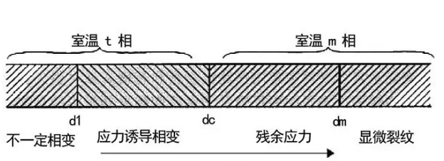 誘發顯維裂紋的臨界直徑dm。當d>dc的晶粒室溫下為m相,由于相變的體積效應,產生顯微裂紋或應力。d>dm的晶粒相變時,相變產生的積累變形大,誘發顯微裂紋。dc>d>dm的晶粒相變時,相變產生的積累變形小,不足誘發顯維裂紋,當其周圍存在殘余應力。