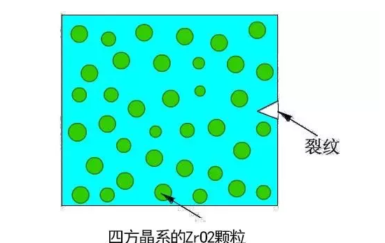 氧化鋯中四方相向單斜相的轉變可通過應力誘發產生。當材料受到外界拉應力時,基體對ZrO2的壓抑作用得到松弛,ZrO2顆粒即發生四方相到單斜相的轉變,這種相變將吸收能量而使裂紋尖端的應力場松弛,增加裂紋擴展阻力,從而大幅度提高陶瓷材料的韌性。