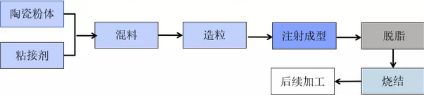 (不同的顏色屬于不同的工藝步驟,分別為喂料制備、注射成型、脫脂、燒結四個步驟)