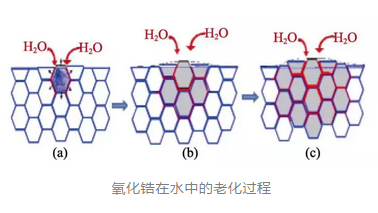 ②隨后,環(huán)境中的水分通過(guò)微裂紋滲透到材料內(nèi)部,進(jìn)一步引發(fā)材料內(nèi)部的氧化鋯發(fā)生t→m轉(zhuǎn)變。