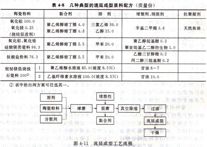 基于以上的原料選擇原則選擇合適的原料進(jìn)行流延漿料的制備,典型的漿料配方和工藝流程如表4—8和圖4-11所示。